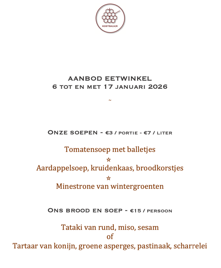 Je kan ook gewoon SOEP bij ons krijgen: €3/portie ; €7/liter – altijd keuze tussen twee soepen.