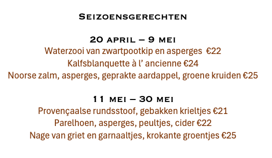 ONZE SEIZOENSGERECHTEN Elke week bieden wij met Kostba(a)r enkele seizoensgerechten aan. ONS AANBOD VOOR DE MAAND APRIL-MEI 2026: Dit delen: Delen op X (Opent in een nieuw venster) X Share op Facebook (Opent in een nieuw venster) Facebook Vind-ik-leuk Aan het laden...